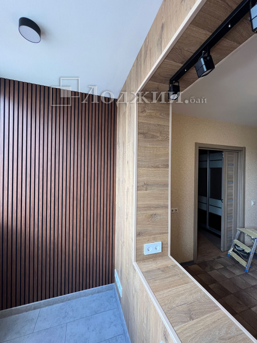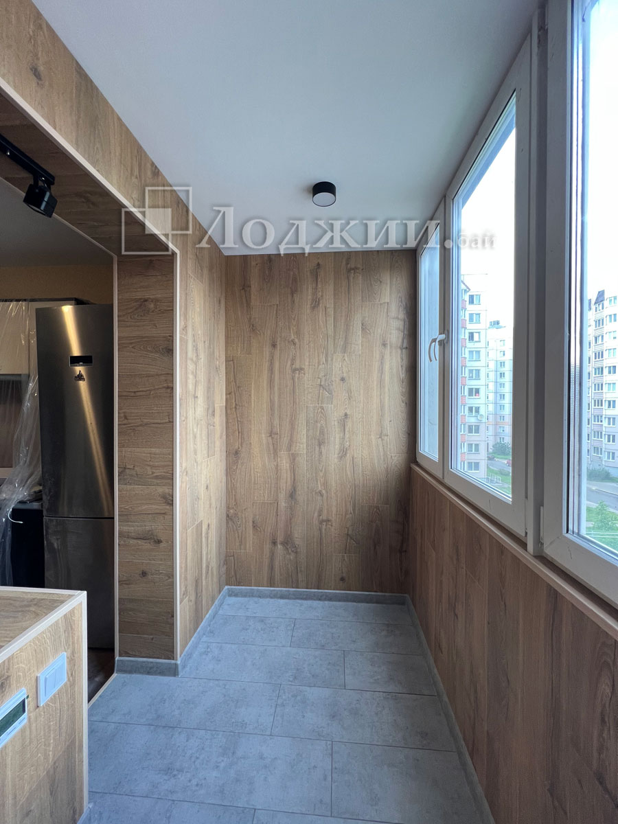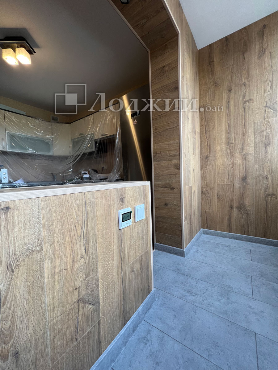История данного объекта достаточно распространенная, а именно, заказчик своими силами начал утеплять лоджию. Кое-как утеплил, сделал пол и тд....потом смотрят вместе с женой и думают "что-то не то". Звонок нам и через 5 дней объект сдан. Все демонтировали до основания, грамотно утеплили, произвели отделку ламинатом в комбинации с декоративными рейками, подключили теплый пол. Сделали объединение балкона с комнатой, смонтировали откосы. Заказчики очень довольны нашей работой! И немного жалеют, что перевели материал да и потратили кучу своего времени.