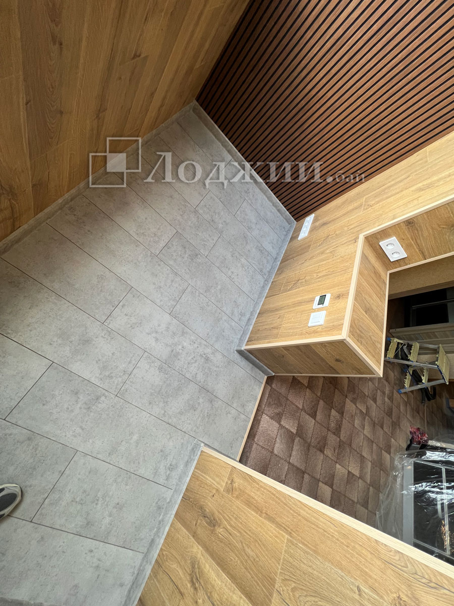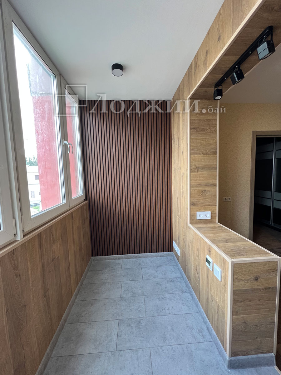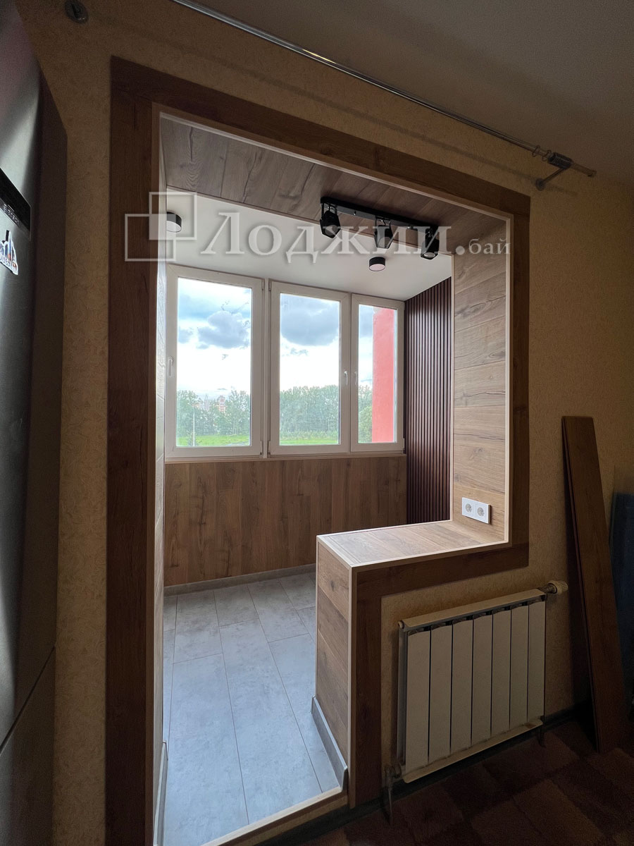 История данного объекта достаточно распространенная, а именно, заказчик своими силами начал утеплять лоджию. Кое-как утеплил, сделал пол и тд....потом смотрят вместе с женой и думают "что-то не то". Звонок нам и через 5 дней объект сдан. Все демонтировали до основания, грамотно утеплили, произвели отделку ламинатом в комбинации с декоративными рейками, подключили теплый пол. Сделали объединение балкона с комнатой, смонтировали откосы. Заказчики очень довольны нашей работой! И немного жалеют, что перевели материал да и потратили кучу своего времени.