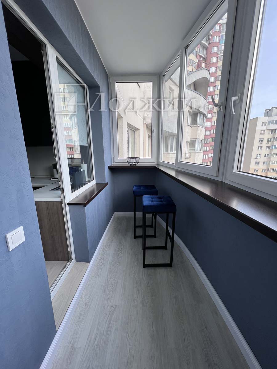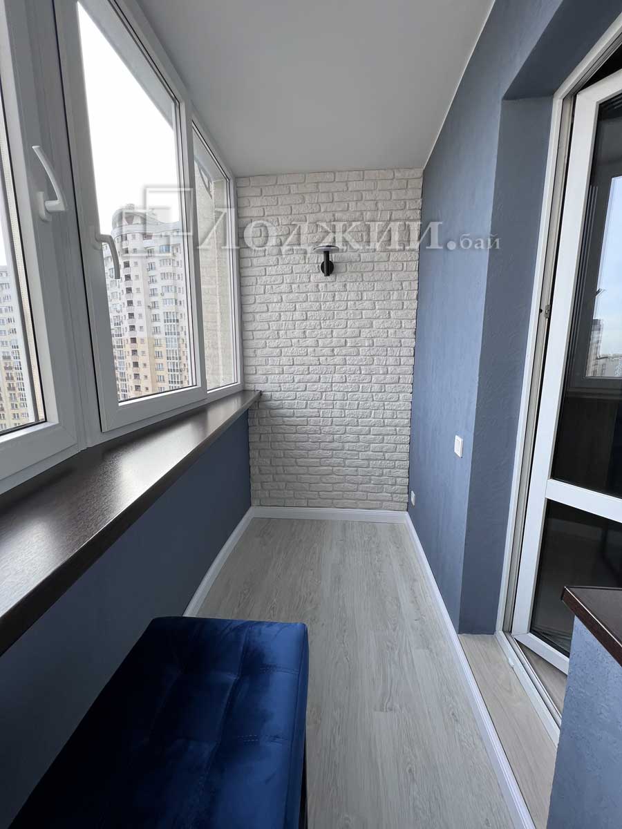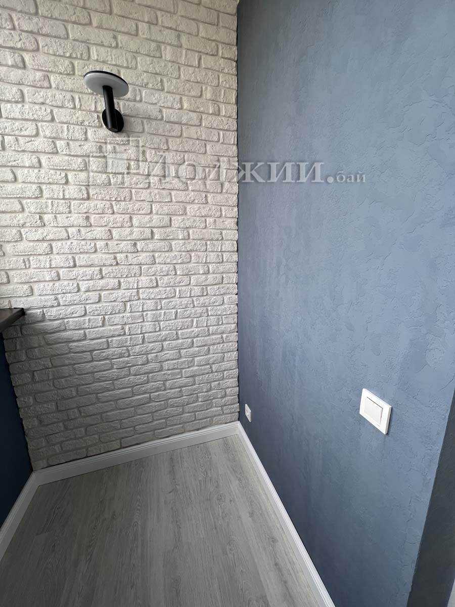 Трапецевидная классическая лоджия. Производили минимальное утепление потолка и стен балкона, в дальнейшем стены были отштукатурены и на нанесена декоративная штукатурка "американка". Потолок под покраску. Развели электрику на балконе, пол - винил, на правой стене декоративный камень. Срок выполнения работ 5 дней.