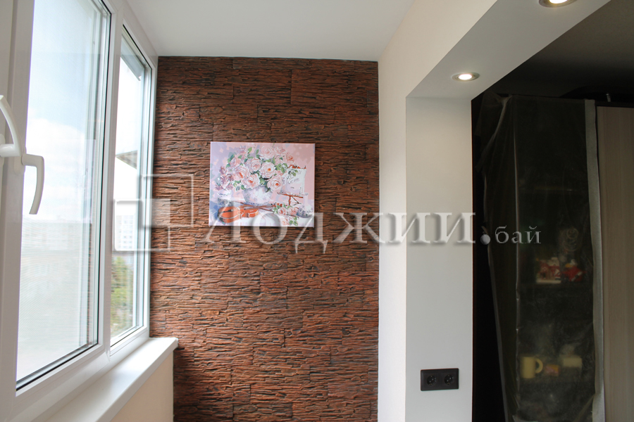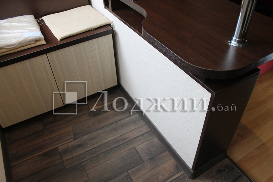 Объединение балкона с комнатой - задача не простая и основная сложность в качественном утеплении балкона. Утепление балкона производится только экструдированным пенополистиролом и пенофолом, мин.вата не применяется! В качестве отделки данной лоджии использовали декоративную штукатурку "американка". Теплый пол - инфракрасная пленка, ламинат. По окончанию работ была изготовлена и установлена мебель.