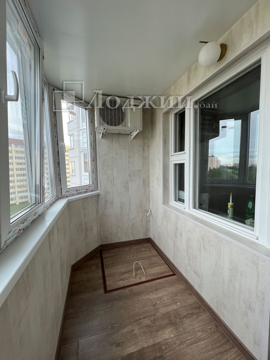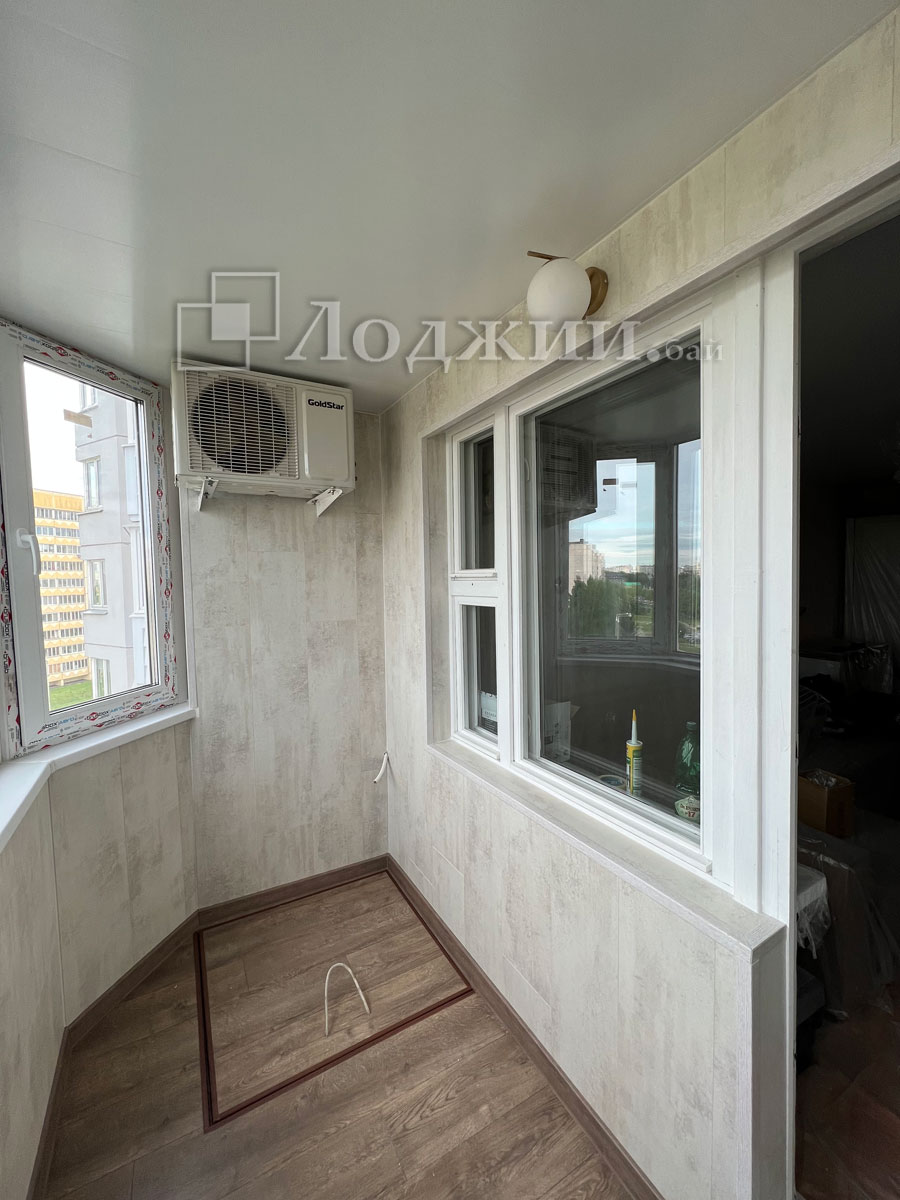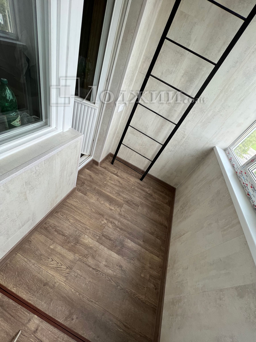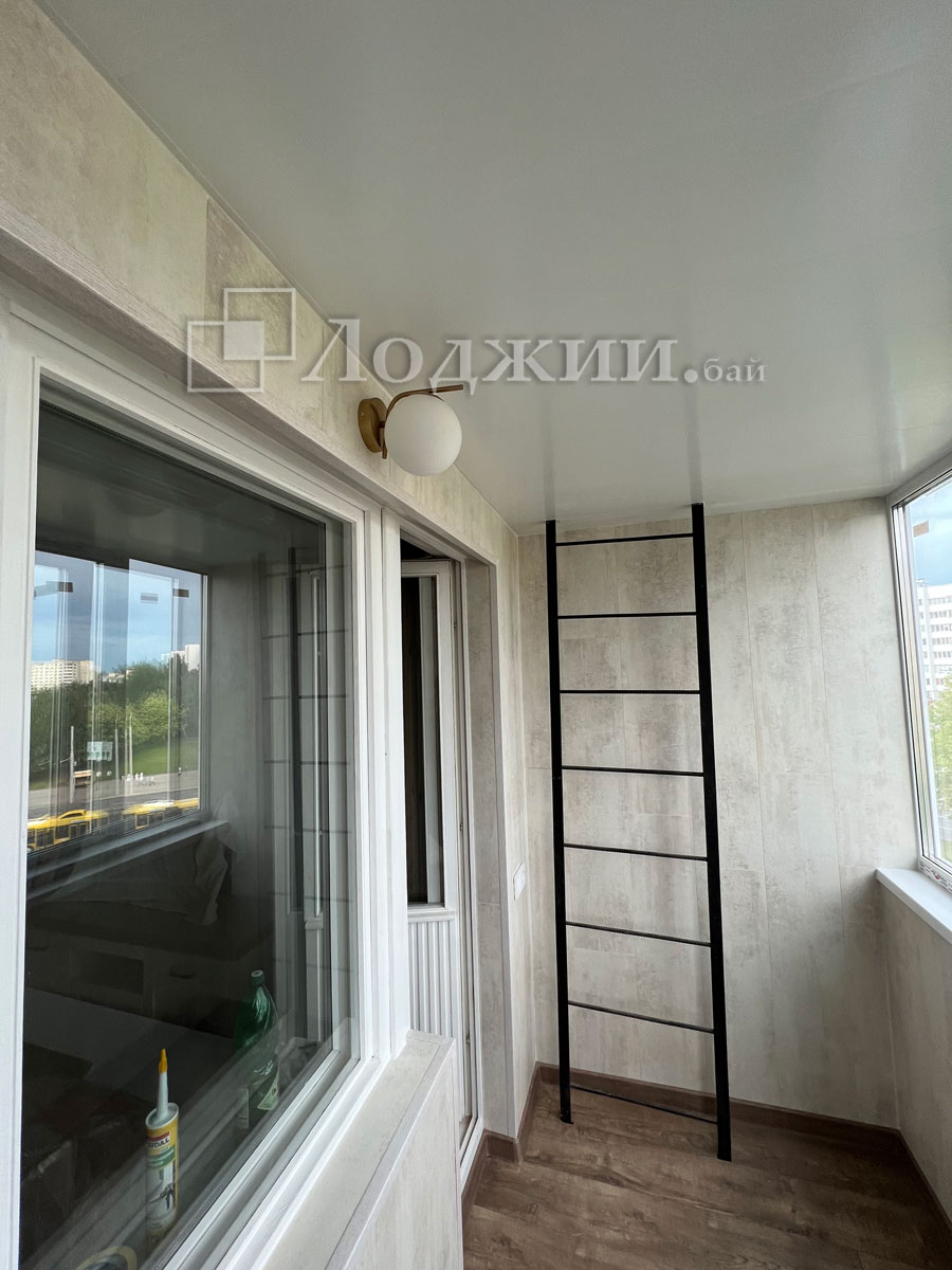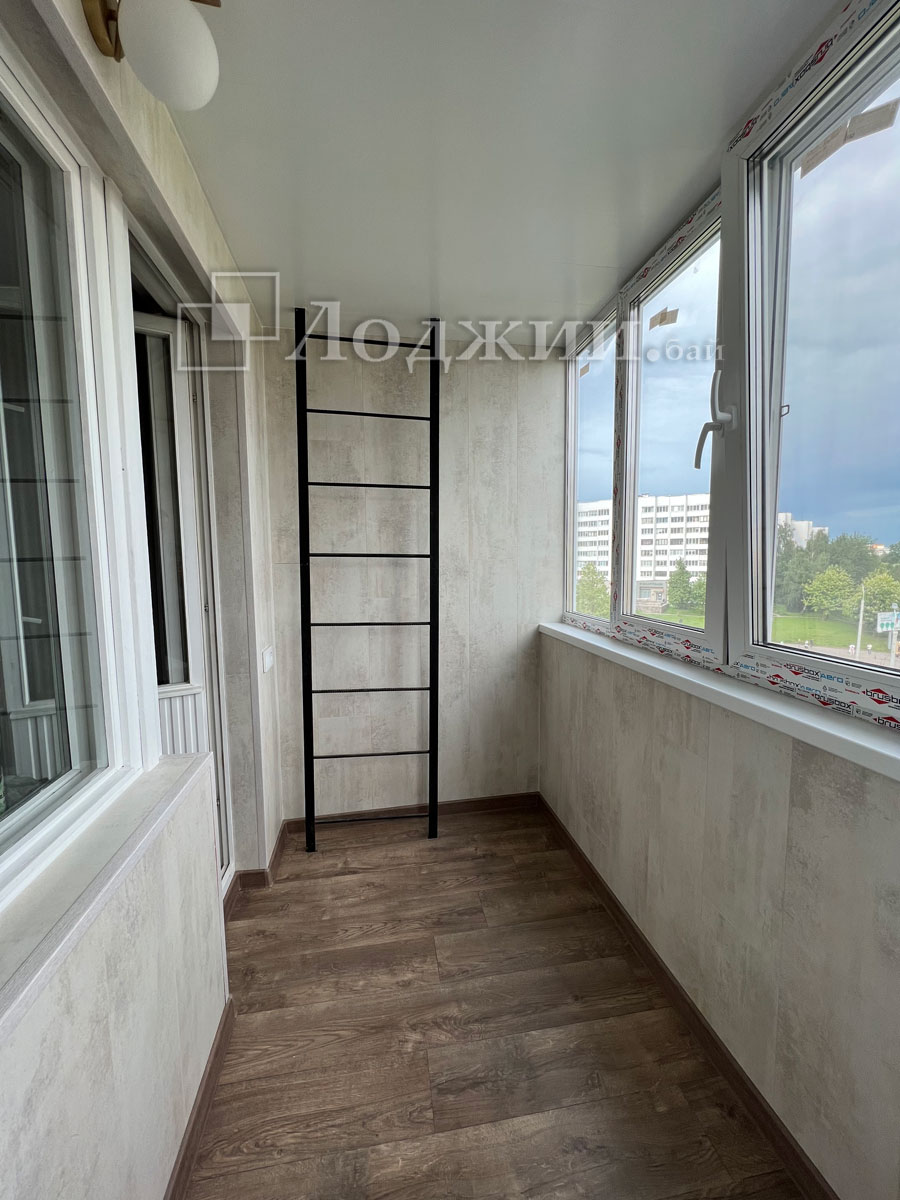 Утепление балкона в Минске - это наше самое важное направление. Наша систпема утепления позволяет использовать балкон круглогодично при использовании источника тепла. Произвели отделку ламинатом, пол также ламинтам. Электрика и пожарная лестница. Сроки 6 дней.