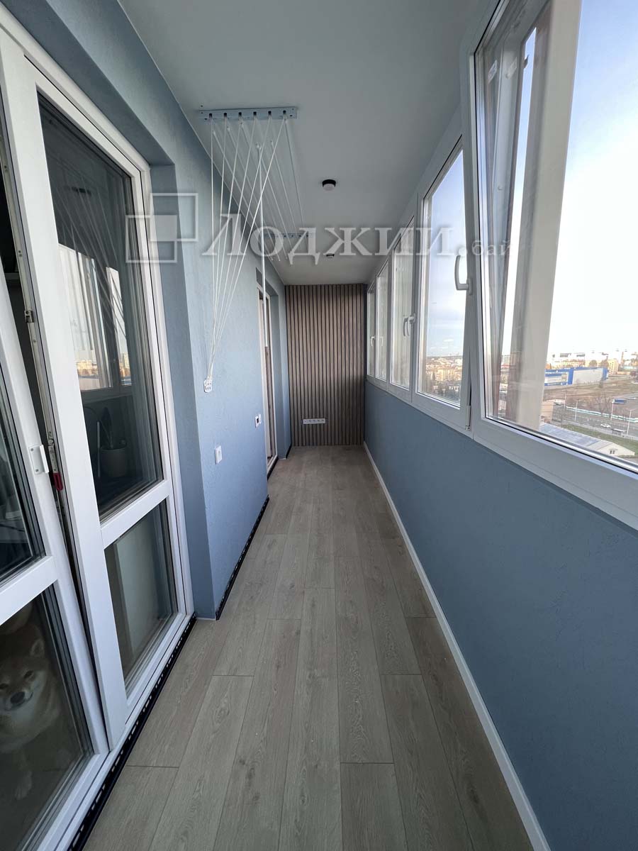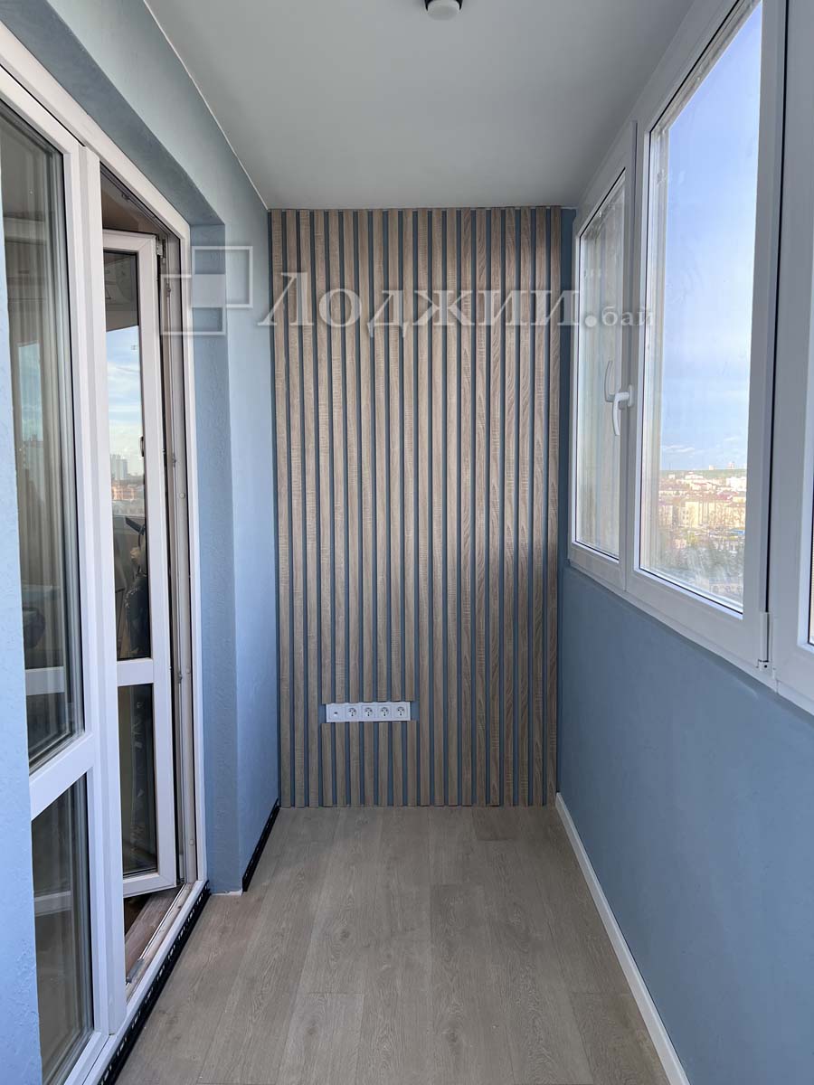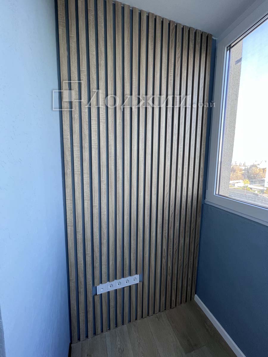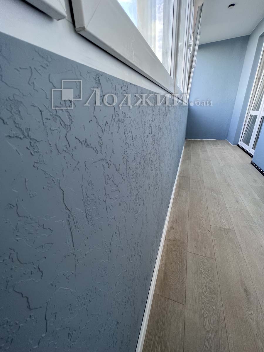 Большая лоджия около 7х1.25м. Была поставлена задача - сделать рабочий кабинет на балконе. Для этого было заменено остекление, далее утепление всех стен пеноплексом, штукатурка, декоративная штукатурка "американка", потолок у нас под покраску. На правой стене были смонтированы декоративные рейки из МДФ. Электрика: освещение, теплый пол, регулятор, розетки, витая пара. Срок выполнения работ 9 дней.